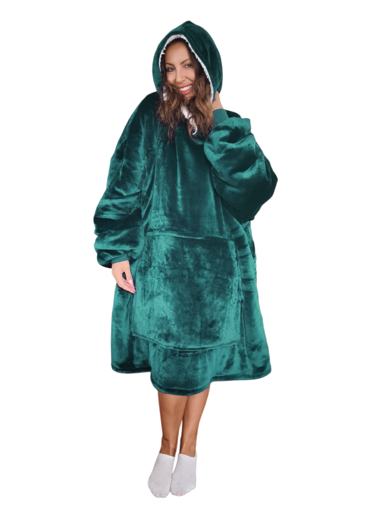 This Elf Green over sized wearable blanket is 100cm wide in the body and 95 cm long from shoulder to bottom. The fabric is 100% polyester and is made from two layers of fabric which are bonded together, the outer layer is a fluffy polyester fleece fabric which is 250 grams per square meter thick and the inner sherpa layer is also 250 grams per square meter thick, thus the total thickness is 500 grams per square meter, the thickest material for this product on the market.